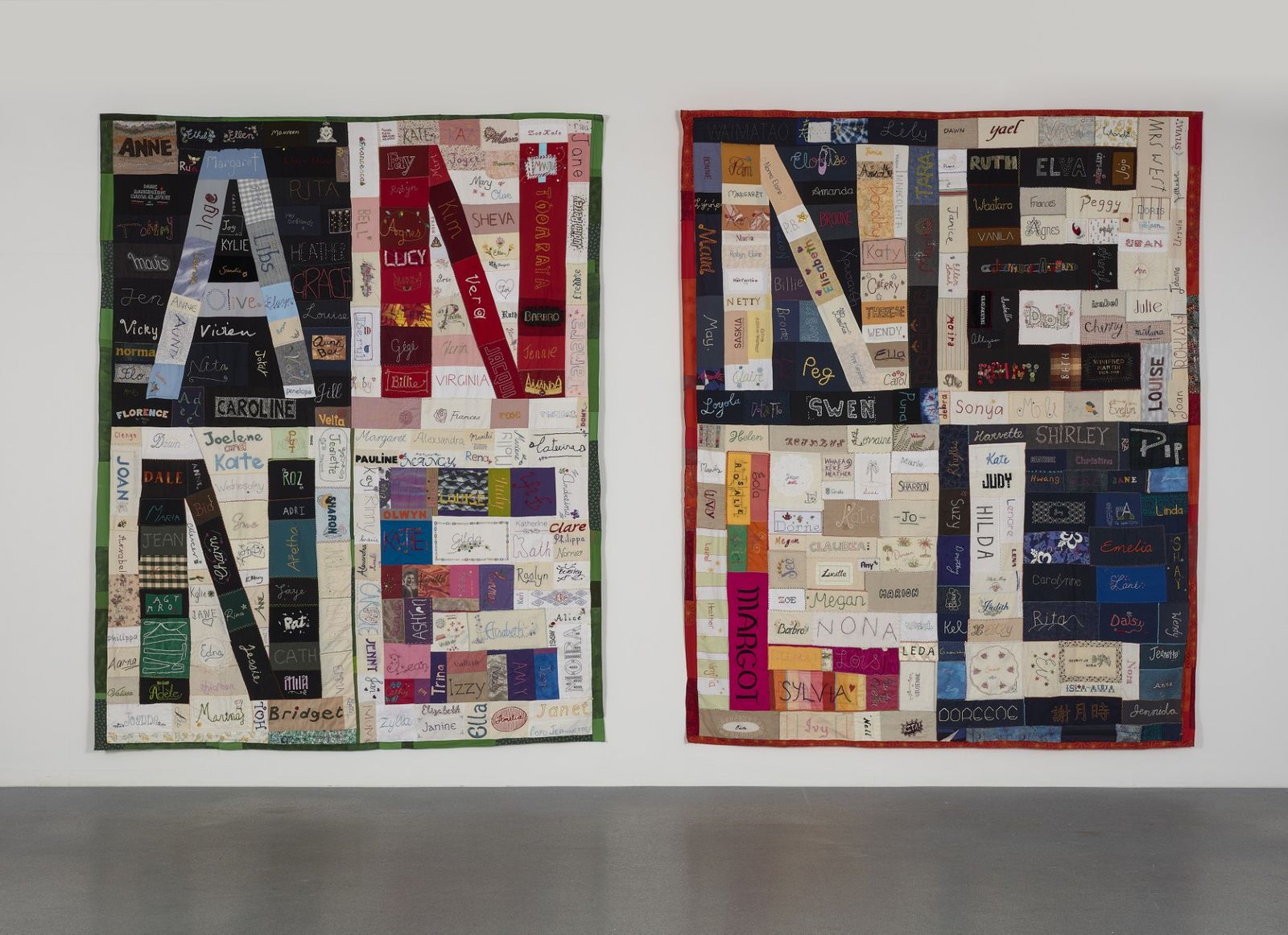 The patches from women all over NZ, and beyond were quilted together forming a patchwork of many women’s names in homage to women’s creativity and craft, work and labour. One forming the name ANNE, after Anne McCahon (nee Hamblett), and the other with the artist’s name – NELL, acknowledging where the particularities of Anne & Nell’s individual stories interchange with a collective female history.