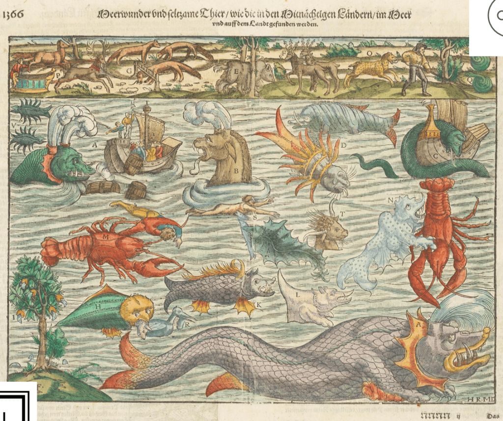 The item I chose was a Sean Monster woodcut, dated 1550 by Sebastian Munster. This hand coloured woodcut shows various sea monsters, taken from the 1550 German edition of Sebastian Munsters Cosmographia, where a gathering of hypothetical sea creatures are depicted.